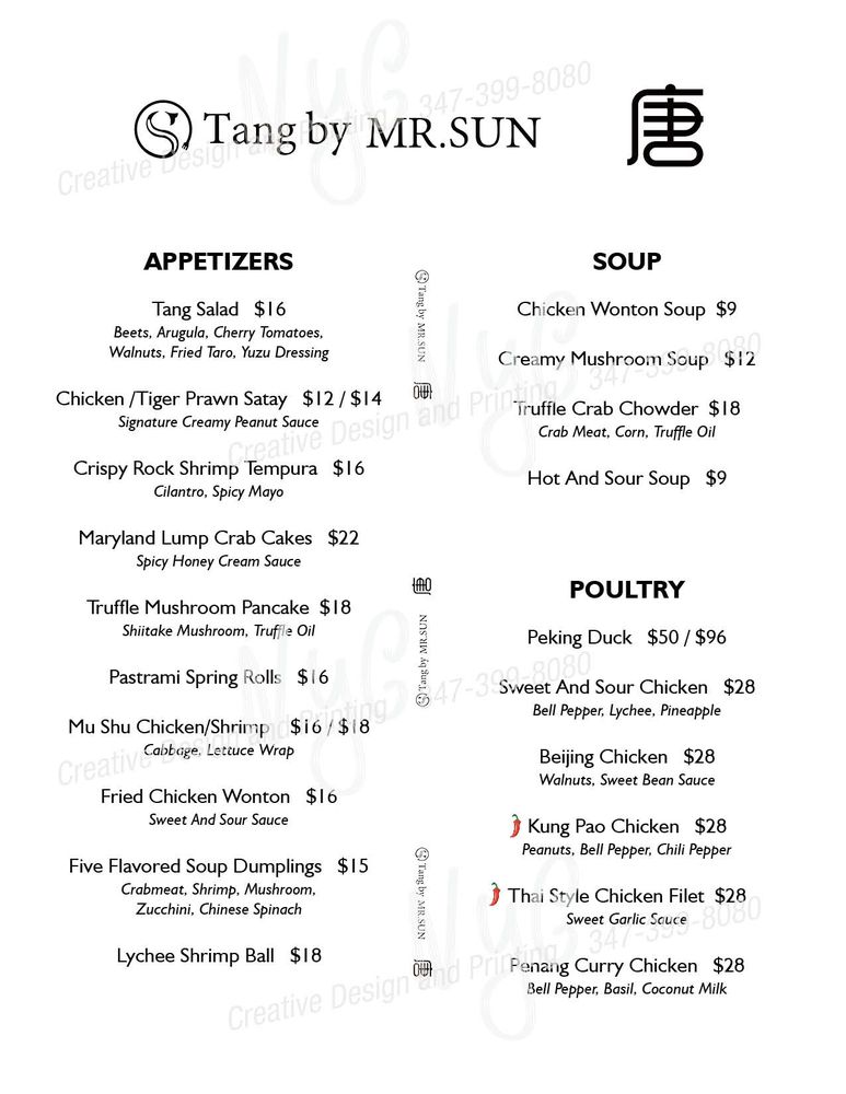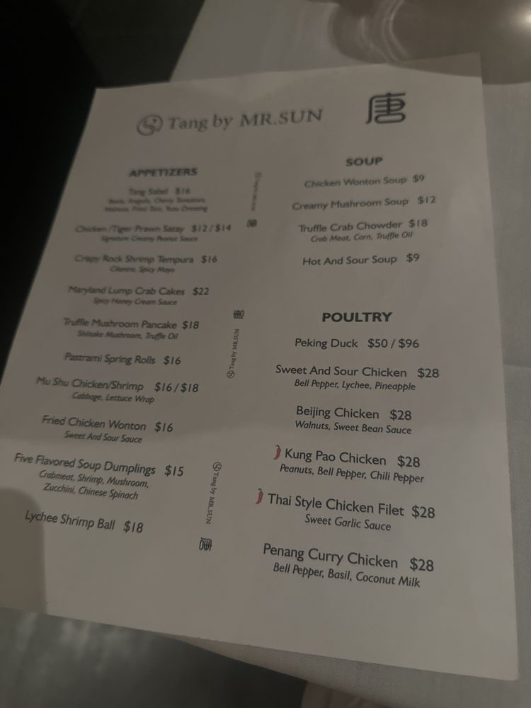 Tang By Mr. Sun, located in New York City, offers a unique dining experience with its Asian Fusion cuisine. The restaurant provides a relaxing and upscale atmosphere, perfect for a romantic dinner or special celebration. Known for their delicious Peking duck, Tang By Mr. Sun impresses customers with its crispy skin and perfectly thin pancakes. The menu also features a variety of innovative and flavorful dishes, such as rock shrimp, sweet and sour chicken, and glazed cod. The attentive staff, beautiful ambiance, and exceptional food make Tang By Mr. Sun a must-visit spot for food enthusiasts. With options for delivery, takeout, and catering services, Tang By Mr. Sun caters to a wide range of preferences and occasions.